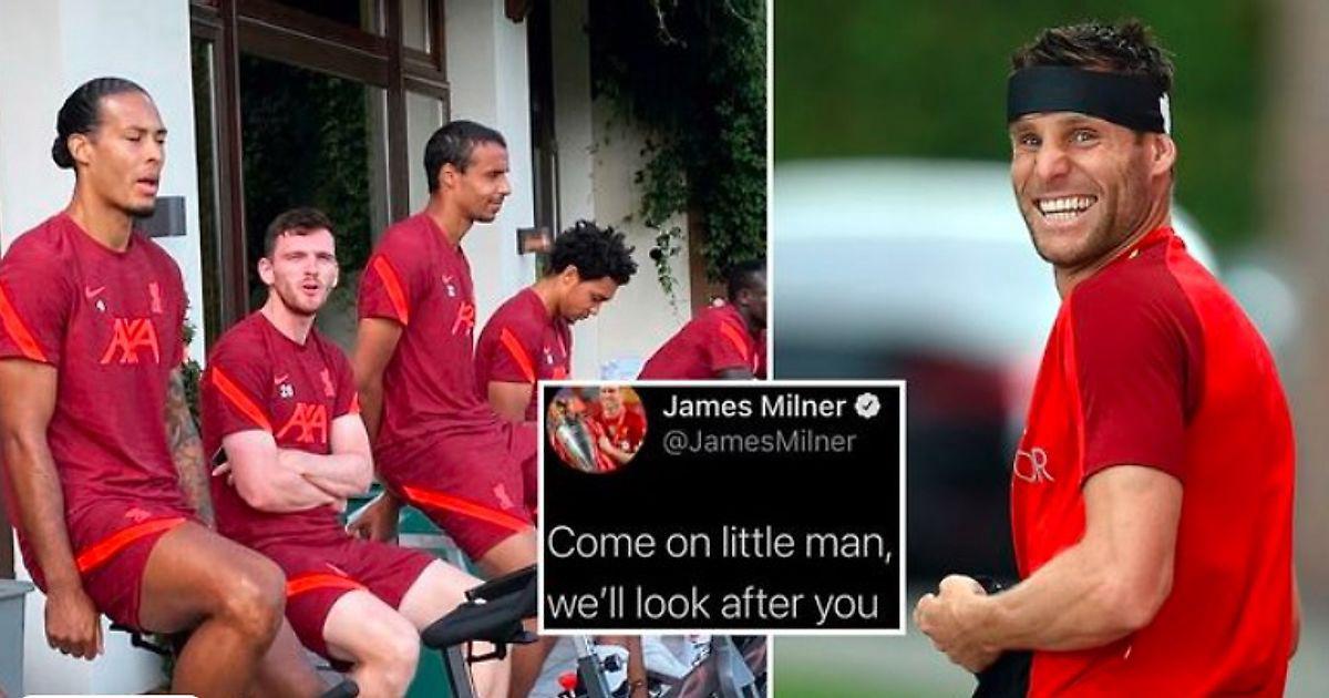 «Давай, малыш, поедем покататься на велосипеде, мы присмотрим за тобой», - Джеймс Милнер выложил фото в Twitter, где Энди Робертсон, Верджил Ван Дейк и Жоэль Матип занимаются на велосипеде во время последней тренировки в Эвиане.