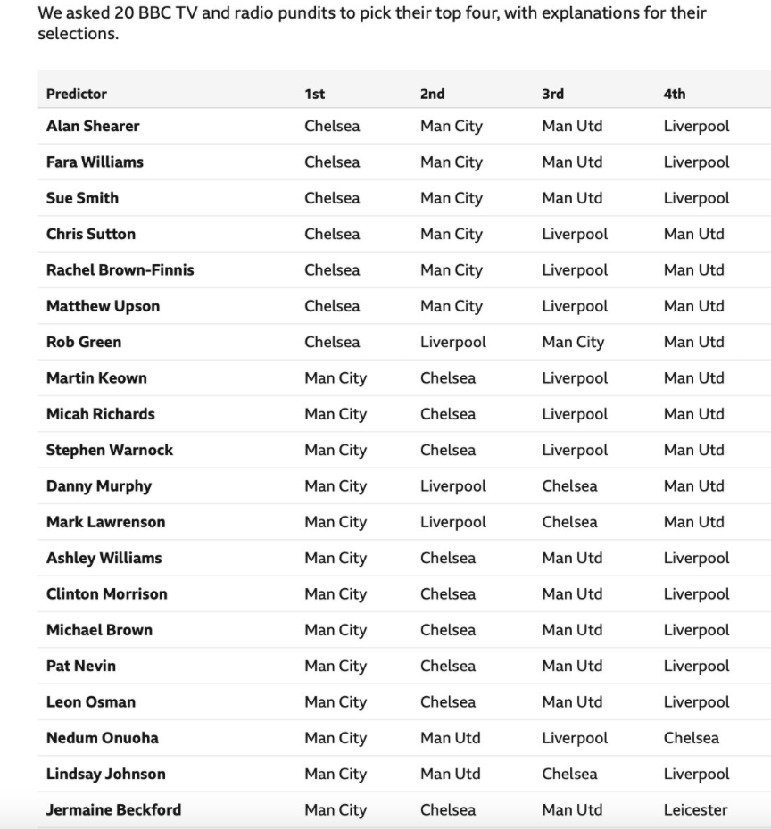 BBC опубликовала список прогнозов своих экспертов - они попросили 20 из них составить топ-4 на следующий сезон.