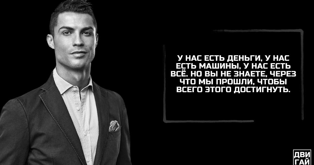 Криштиану Роналду является одним из самых лучших футболистов в мире на данный момент. Ему уже 36 лет, но он по-прежнему остается на высоком уровне. Благодаря своей упорной каждодневной работе, у него получилось достигнуть всего, что он имеет на данный момент. Как-то раз Роналду сказал цитату, которая очень сильно запала мне в душу, послушайте: