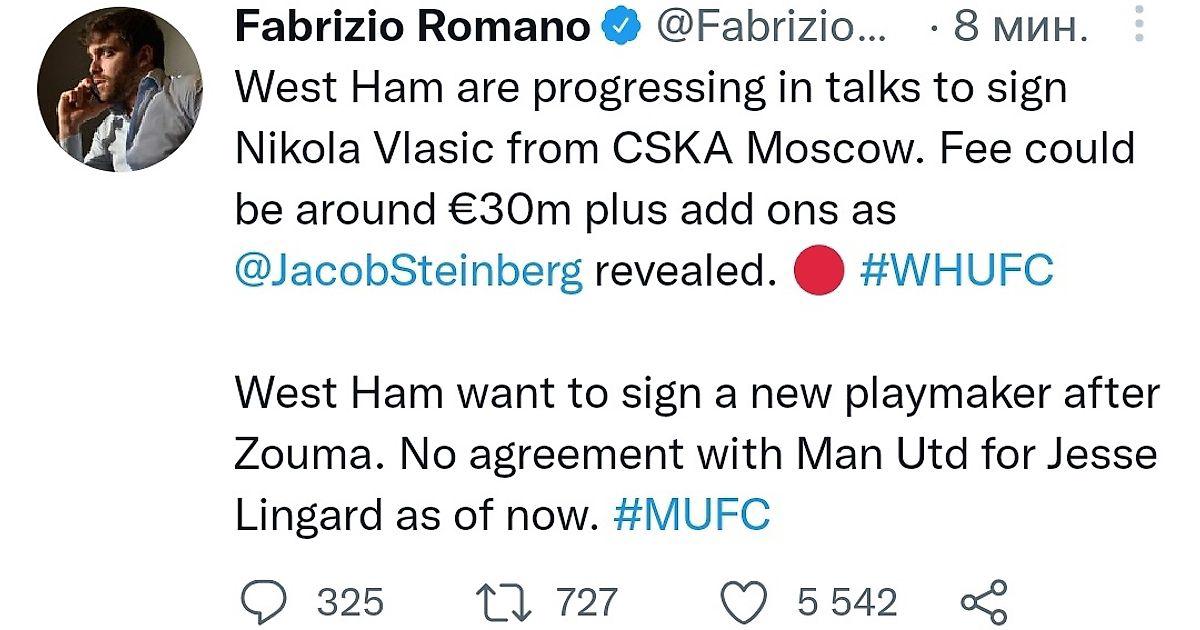 «Вест Хэм» в продвинутых переговорах с ЦСКА по Влашичу: сумма трансфера может составить 30 млн евро + бонусы