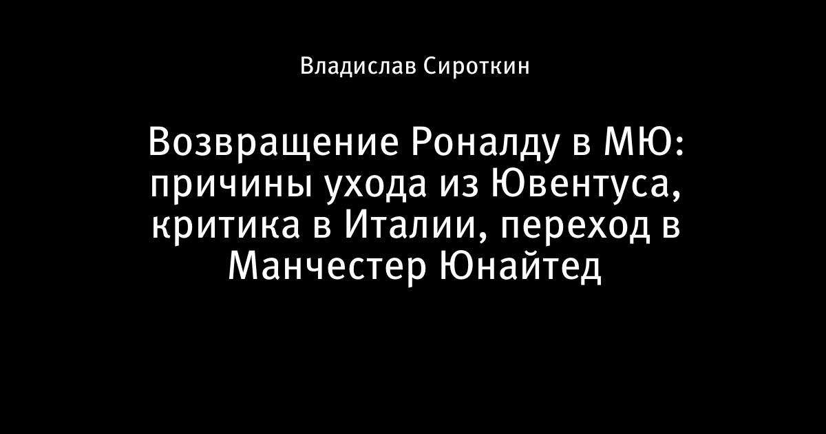 Спустя 12 лет Криштиану Роналду возвращается в Манчестер Юнайтед. Спасибо Сэру Алексу Фергюсону и Мино Райоле за такую возможность снова увидеть Роналду на Олд Траффорд. Англия приветствует Криштиану Роналду в отличии от Италии, в которой развернулась настоящая информационная война против Криштиану. Думаю, это главная причина ухода Роналду из Ювентуса