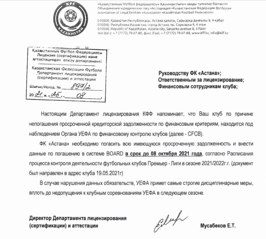 «Астана» 2016 жыл мен 2020 жылдар аралығындағы қарыздарын 8 қазанға дейін төлемесе, онда ұжым келесі жылы еурокубок ойындарына қатысу құқығынан айырылады.