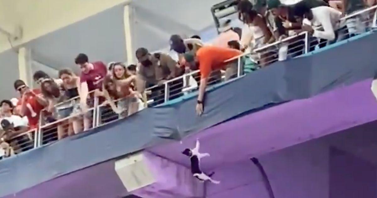 На матче по студенческому американскому футболу кот упал с верхней трибуны. Его спасли, растянув флаг