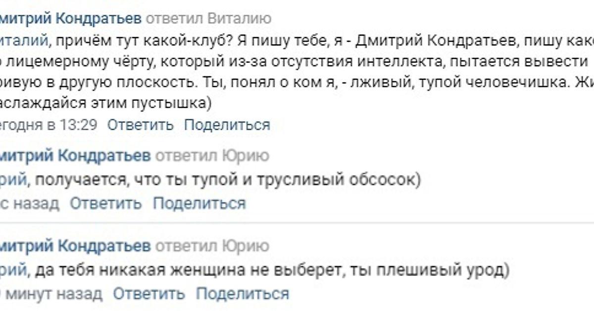 В третьем дивизионе России тоже кипят страсти – в субботу живо было в группе болельщиков «Сибири» во «ВКонтакте», где после банкротства старого клуба обсуждают новости созданного в 2019-м «Новосибирска». Еще в четверг в паблике появился пост про пресс-атташе клуба Дмитрия Кондратьева, но все веселье началось на выходных, когда до него добрался сам герой публикации. Вот тот самый пост, который спровоцировал ветку с сотнями комментариев.