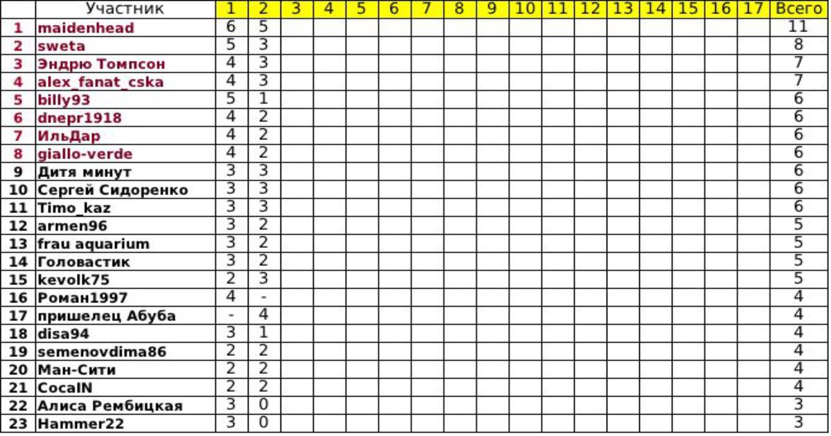 Все молодцы! Ниже представлена итоговая таблица, после двух туров.