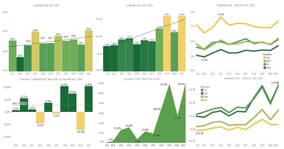 В среднем стоимость футболистов каждый год увеличивается на 10.6%. На первом графике мы наблюдаем, что увеличение стоимости происходит практически каждый год - исключением стали только 2014-ый, 2016-ый и 2020-ый год, когда происходила дефляция цен. На втором графике можно посмотреть, как изменились цены относительно 2011-го года. На текущий момент увеличение стоимости составляет 118.8%, то есть, если в 2011-ом году среднестатистического футболиста национальной сборной можно было приобрести примерно за 1.5 млн евро, то в 2021-ом за такого же игрока нужно отдать уже 3.2 млн евро.