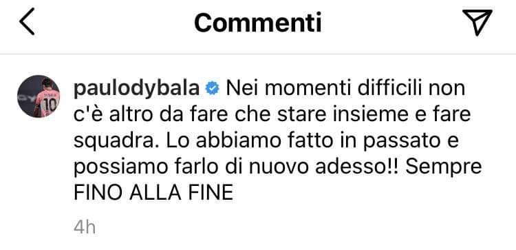 Пауло Дибала также оставил вдохновенный комментарий: «В такие сложные моменты ничего не остается, как быть вместе и оставаться командой. Мы делали это в прошлом, и мы можем сделать это снова сейчас».