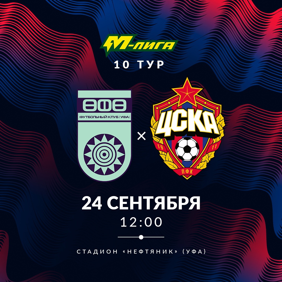 24 сентября на стадионе «Нефтяник» (г. Уфа, ул. Комарова, 9) состоится матч 10-го тура Молодежного первенства России «Уфа» — ПФК ЦСКА. Начало встречи в 12:00 мск.