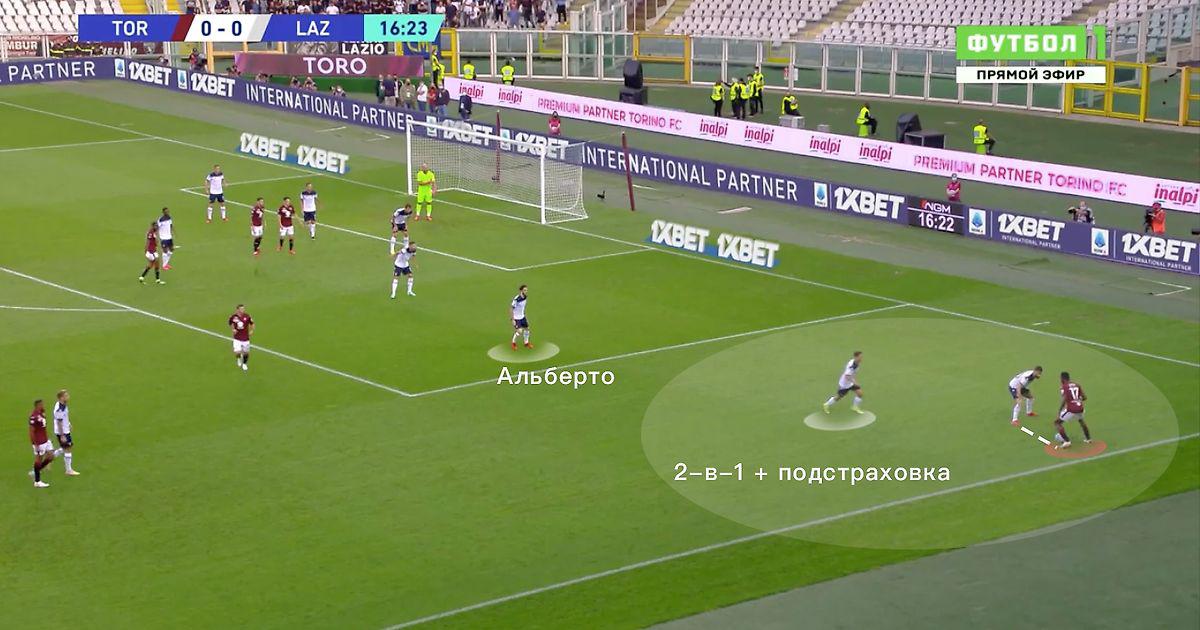 Также стоит обратить внимание на положение латералей "Торино": изначально оба в высоких позициях, но после вертикальной передачи от Рейны дальний игрок садится глубже.