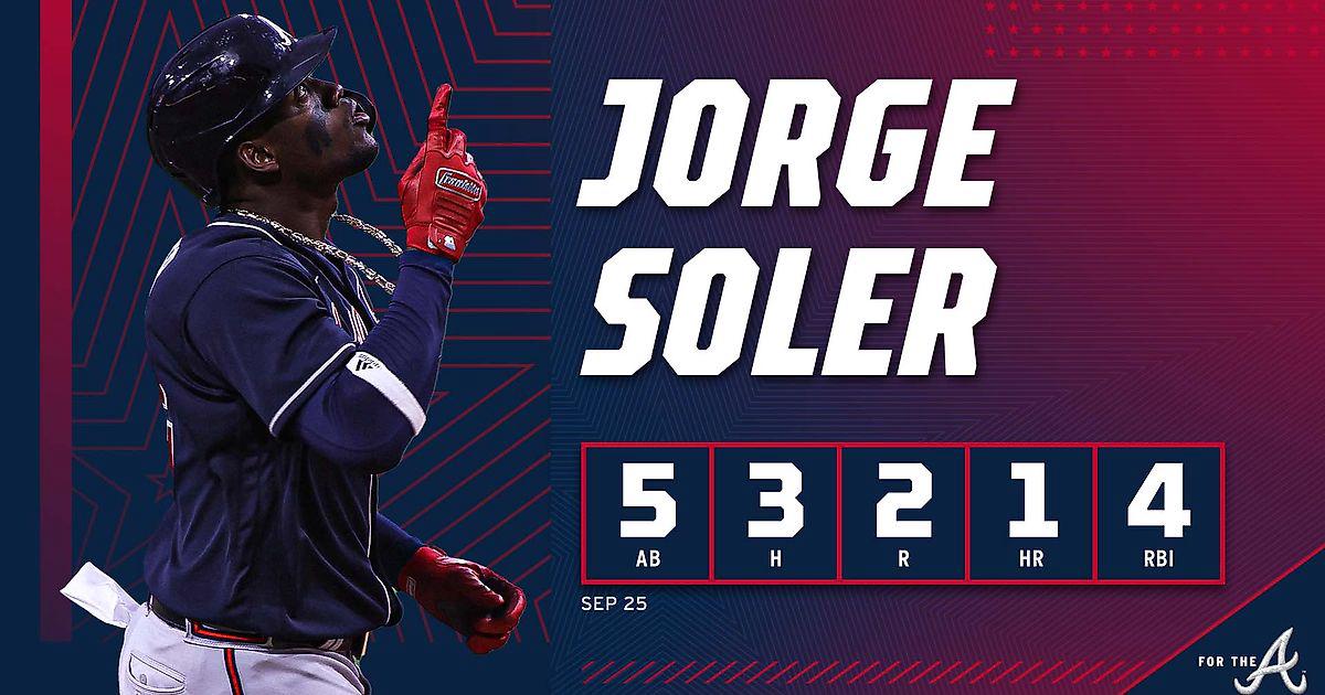 В 3 иннинге Оззи Албис выбил сингл и Дансби Суонсон принёс гостям первое очко.Затем Остин Райли выбил сингл и Хорхе Солер прибежал в дом.