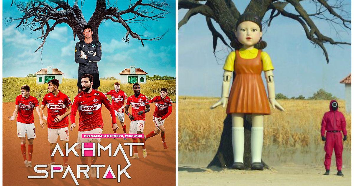 На афише, которая копирует постер южнокорейского сериала «Игра в кальмара», игроки «Спартака» изображены в роли персонажей сериала, участвующих в детских играх с целью получить большой денежный приз и погасить долги. Вместо большой куклы, которая присутствует в одном из испытаний в сериале, изображён голкипер «Ахмата» Виталий Гудиев.