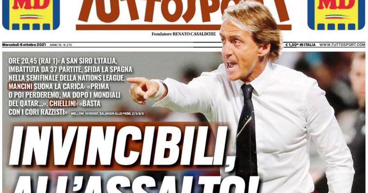 Лига Наций, полуфинал. Италия-Испания, «Сан Сиро», 20:45 (CET). Манчини: «Больше не хотим останавливаться». В Милане все билеты проданы. Кьеза-Инсинье пускаются на штурм. Надежда главного тренера: «Непобедимы вплоть до конца Мундиаля».