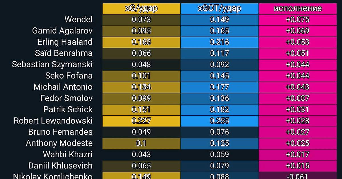 Лучшим по этому показателю в Европе на данный момент возможно неожиданно для вас, является полузащитник Зенита Маркус Вендел. У него разница между xGOT и xG в пересчете на один удар +0,075. Говоря простым языком, в среднем в его исполнении изначальная опасность удара возрастает на 7,5%. Но полагаю куда большей неожиданностью будет для вас то что на втором месте расположился Гамид Агаларов. У нападающего «Уфы» показатель исполнения исходя из расчета равен +0,069. В этом сезоне в чемпионате он сыграл 10 матчей и забил 8 голов, неплохой результат для его скромной цены на трансфермаркет в 1,2 миллиона «европейских рублей». Третьим в списке идет уже более звездный игрок Эрлинг Холанд с показателем +0,053. У него намного выше опасность ударов (xGOT) чем у оппонентов которые расположились выше списка, но изначальная позиция до удара (xG) у него также лучше, и поэтому разница чуть меньше чем у Агаларова и Вендела. Также в топ 14 попал Федор Смолов(+0,037).