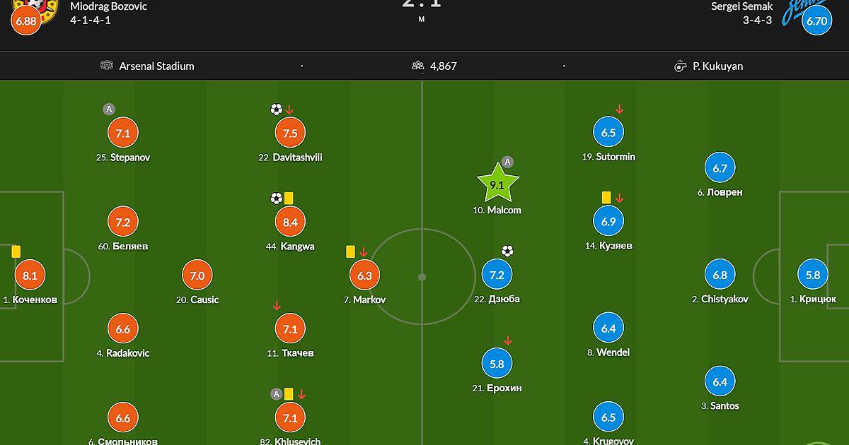 3.В итоге ЦЗ не встречают Маркова. Он отдаёт передачу на Хлусевича, с которым плотно играет Сантос. В зону Ловрена мчится Зурико, Сутормин пытается его догнать.