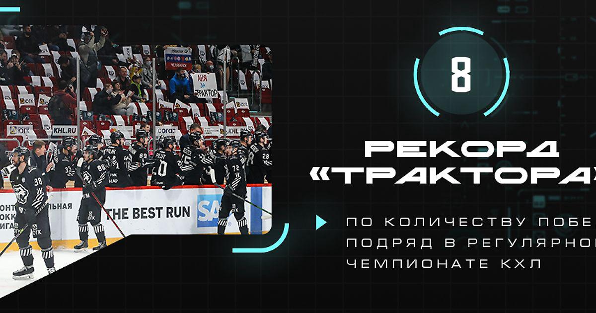 «Трактор» в сезоне 2021/2022 побил рекорд по количеству выигранных матчей подряд в регулярном чемпионате. Сейчас достижение команды Анвара Гатиятулина составляет восемь побед кряду. На этой дистанции «черно-белые» обыграли «Авангард», «Йокерит», дважды «Амур» и «Адмирал», ХК «Сочи» и московское «Динамо». Предыдущий рекорд, равнявшийся семи матчам без поражений, принадлежит также команде Анвара Гатиятулина сезона 2017/2018. 2017/2018 I 7 матчей 11 января – 1 марта vs «Слован» – 3:0 / Братислава vs «Югра» – 4:0 / Ханты-Мансийск vs «Авангард» – 2:1 / Омск vs «Югра» – 2:1 / Челябинск vs «Авангард» – 3:1 / Челябинск vs «Автомобилист» – 3:1 / Екатеринбург vs «Сибирь» – 4:1 / Новосибирск Также отметки в семь побед подряд с «Трактором» добивался Валерий Белоусов в «регулярке» 2011/2012. 2011/2012 I 7 матчей 27 сентября – 14 октября vs «Торпедо» – 5:2 / Нижний Новгород vs «Авангард» – 2:0 / Челябинск vs «Барыс» – 4:3 / Челябинск vs «Металлург» Магнитогорск – 5:1 / Челябинск vs «Нефтехимик» – 4:1 / Челябинск vs «Ак Барс» – 2:1 / Казань vs «Динамо» Москва – 2:0 / Москва