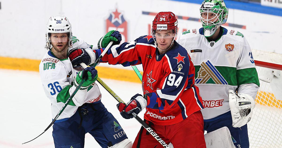 В начале матча армейцы заработали удаление. ЦСКА все две минуты активно штурмовал ворота соперника. Никита Нестеров сильно бросал от синей линии – «зеленых» выручила штанга. А вскоре после этого защитник заработал свой шестой ассистентский балл в шести последних матчах, начав голевую атаку. Владислав Каменев перевел налево, и Артем Сергеев щелкнул из круга вбрасывания, огорчив свою бывшую команду. Счет стал 1:0 в пользу красно-синих.