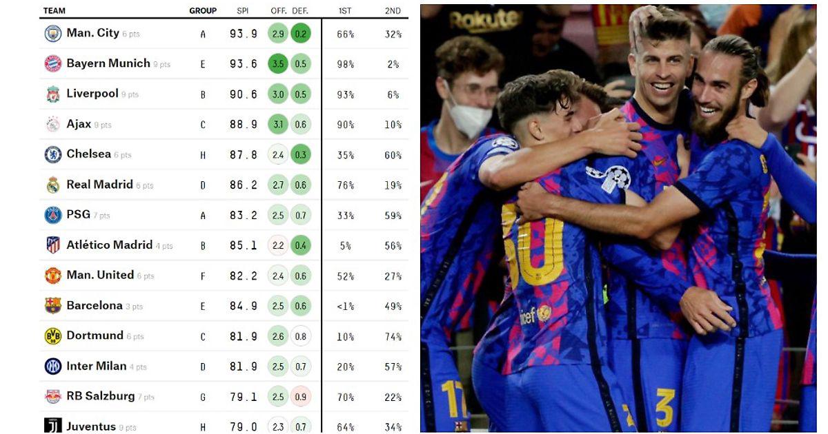 Судя по прогнозу Суперкомпьютера, у «Барселоны» самые низкие из всех топ-клубов шансы выйти в 1/8 финала Лиги чемпионов (всего 50%). Вероятность выхода в четвертьфинал тоже самая низкая — 24%.