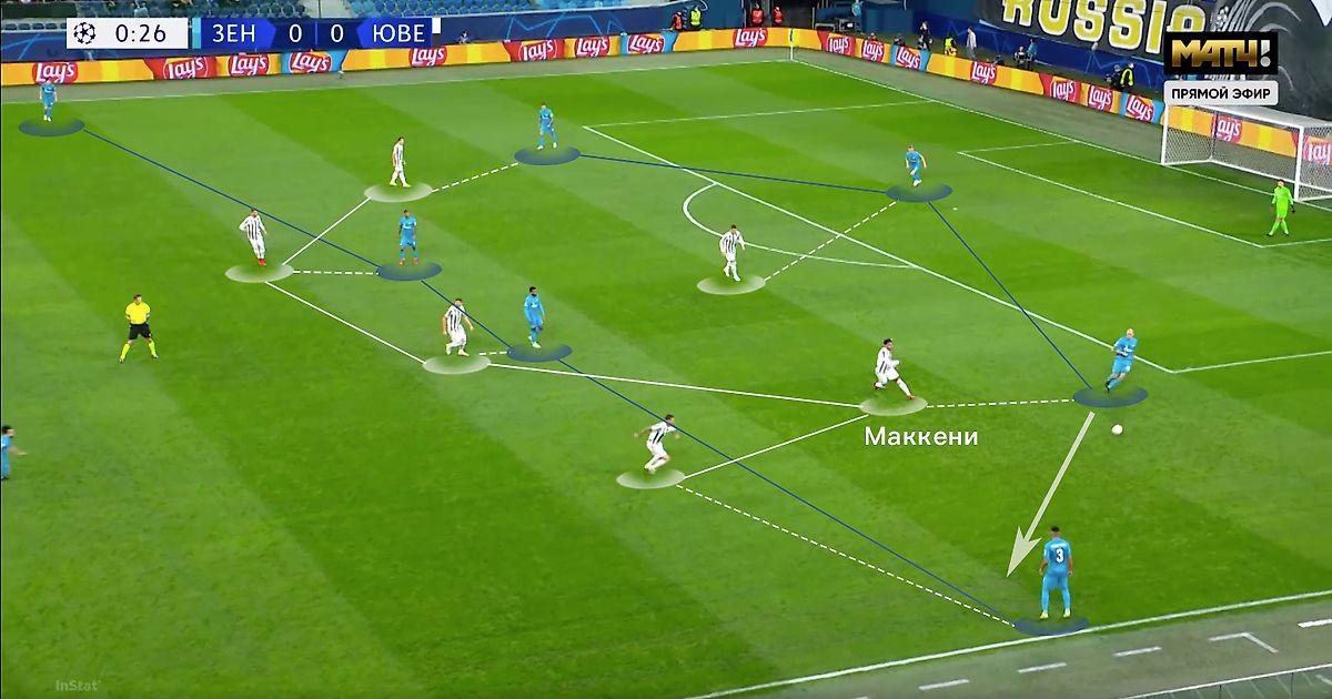 Первая – забросы за последнюю линию "Зенита". Мората часто играл в оттяжке и отскакивал от своего прямого опекуна – Чистякова. У того был выбор: либо до конца выбрасываться за своём опекуном и оставлять большую зону в центре защиты, либо давать свободу испанцу в менее опасных зонах. Чаще всего защитник выбирал именно второй вариант. Но иногда чуть выдвигался за опекуном, и линия теряла стройность, в этот разрыв сразу стартовал Маккенни (именно американец чаще других забегал за спины линии обороны "Зенита"):