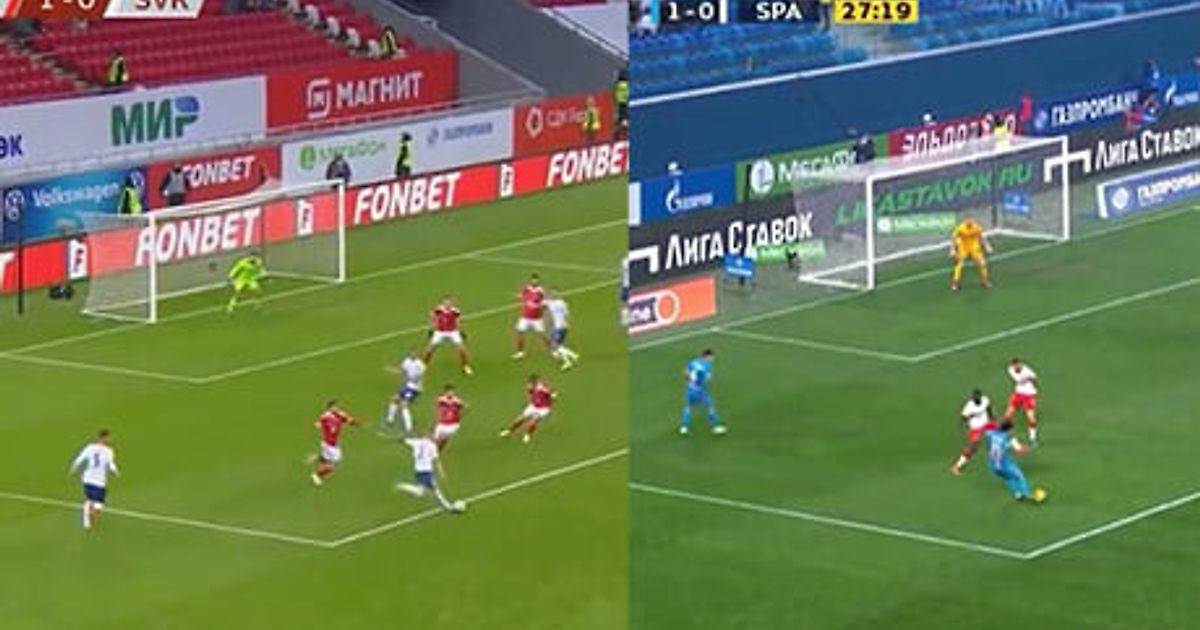 Удары похожие, но стоит отметить, что дистанция удара Клаудиньо была короче, а значит – Максименко было сложнее, чем Сафонову.