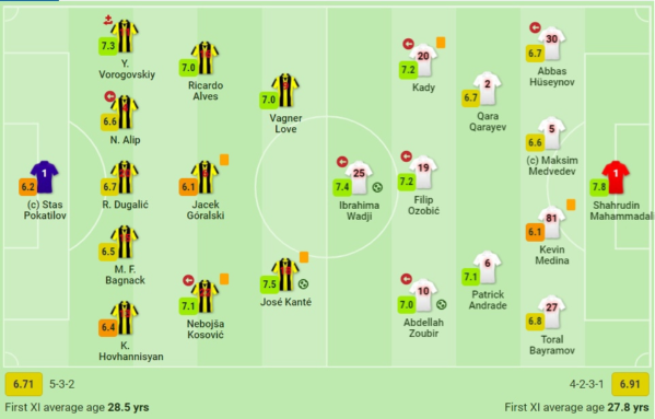 Бұл матчта алматылық «Қайрат» 6,71 ұпай жинаса, «Карабах» 6,91 ұпаймен бағаланды.