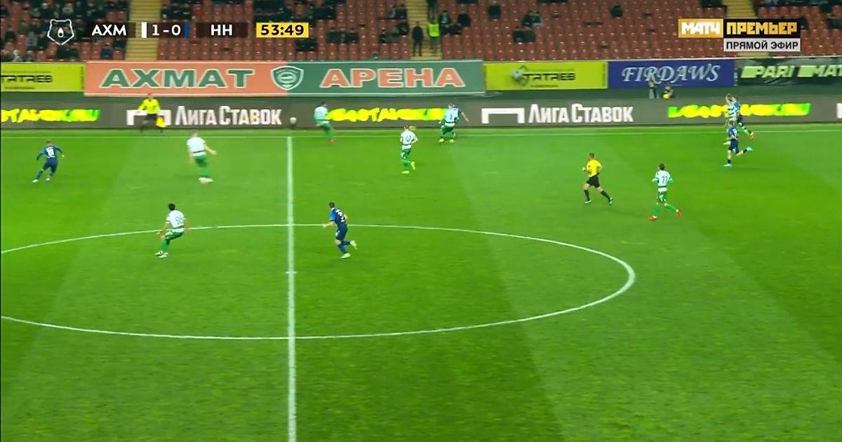 Необычный гол «Нижнего» «Ахмату»: форвард пробежал полполя за мячом, а потом уступил партнеру – потому что был в офсайде