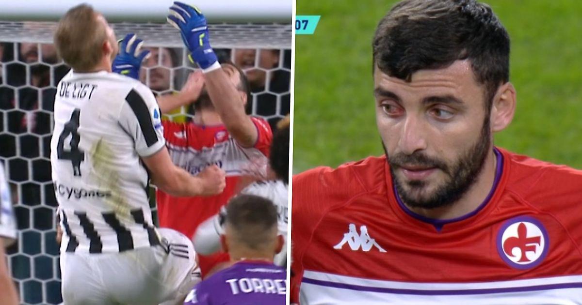 Так на 14-й минуте первого тайма при розыгрыше углового Маттейс де Лигт случайно столкнулся с кипером "Фиалок" Пьетро Терраччано и попал тому пальцами в глаз.