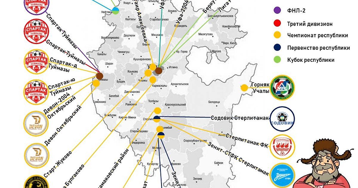 На связи Башкирия, тут большое количество лиг представлено, хотя клубов не так уже много и 4 из них - это Спартак Туймазы.