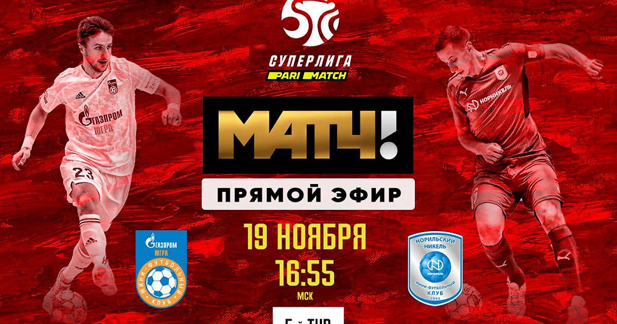 Смотрите первый поединок между МФК "Газпром-Югра" и МФК "Норильский никель" в рамках 5-го тура Париматч-Суперлиги в прямом эфире на телеканале Матч ТВ!