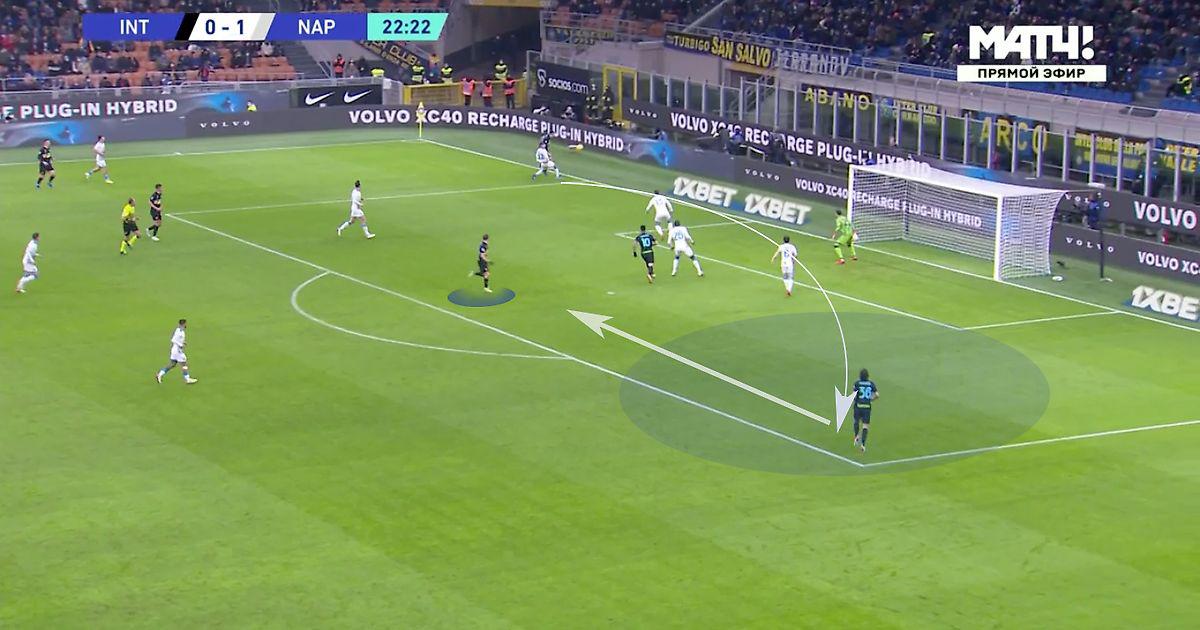 Именно в этом матче "Интер" был особенно нацелен на перегруз последней линии соперника (так как "Наполи играет с 4-кой) и конкретно на зону фулбэков: