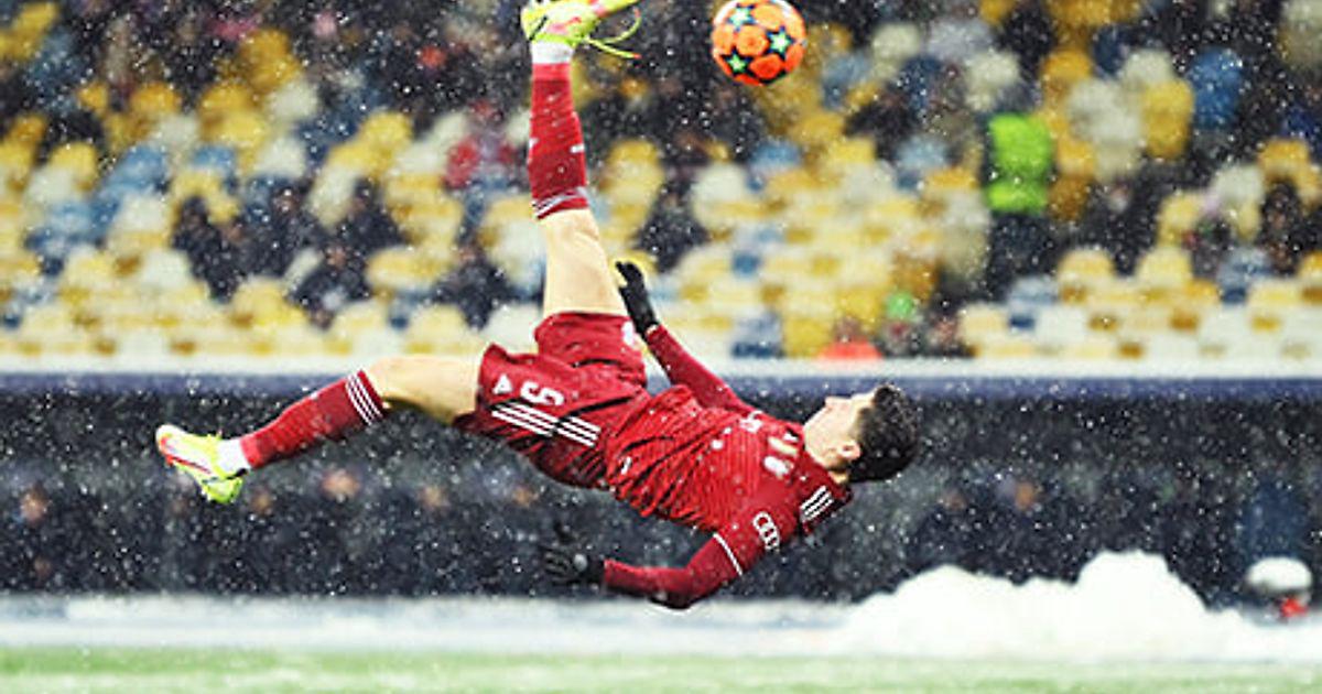 Киев встретил «Баварию» снегопадом, антураж одного из первых матчей дня сразу стал выделяться. А Роберт Левандовски уже на 14-й минуте выкрутил красоту на максимум – забил через себя.
