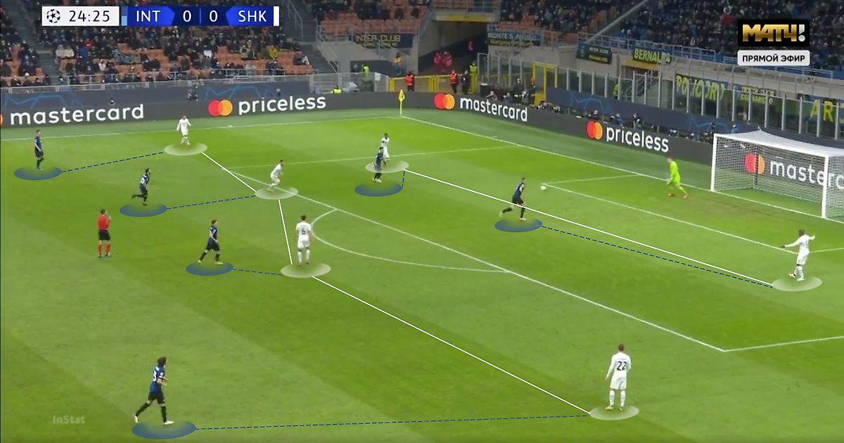 Как уже было сказано выше, в средней трети поля структура "Шахтера" менялась – соответственно менялась и система обороны от хозяев поля. Латерали садились ниже для контроля атакующей пятерки гостей, и средний блок возвращался к классическим 5-3-2. В таком построении "Интер" тоже пытался максимально ограничить соперника в продвижении. Поскольку вингбеки в этой фазе находились низко, на крайних игроков горняков (Додо слева, Степаненко в первом тайме и Антонио во втором – справа) по принципу маятника выдвигались восьмерки: