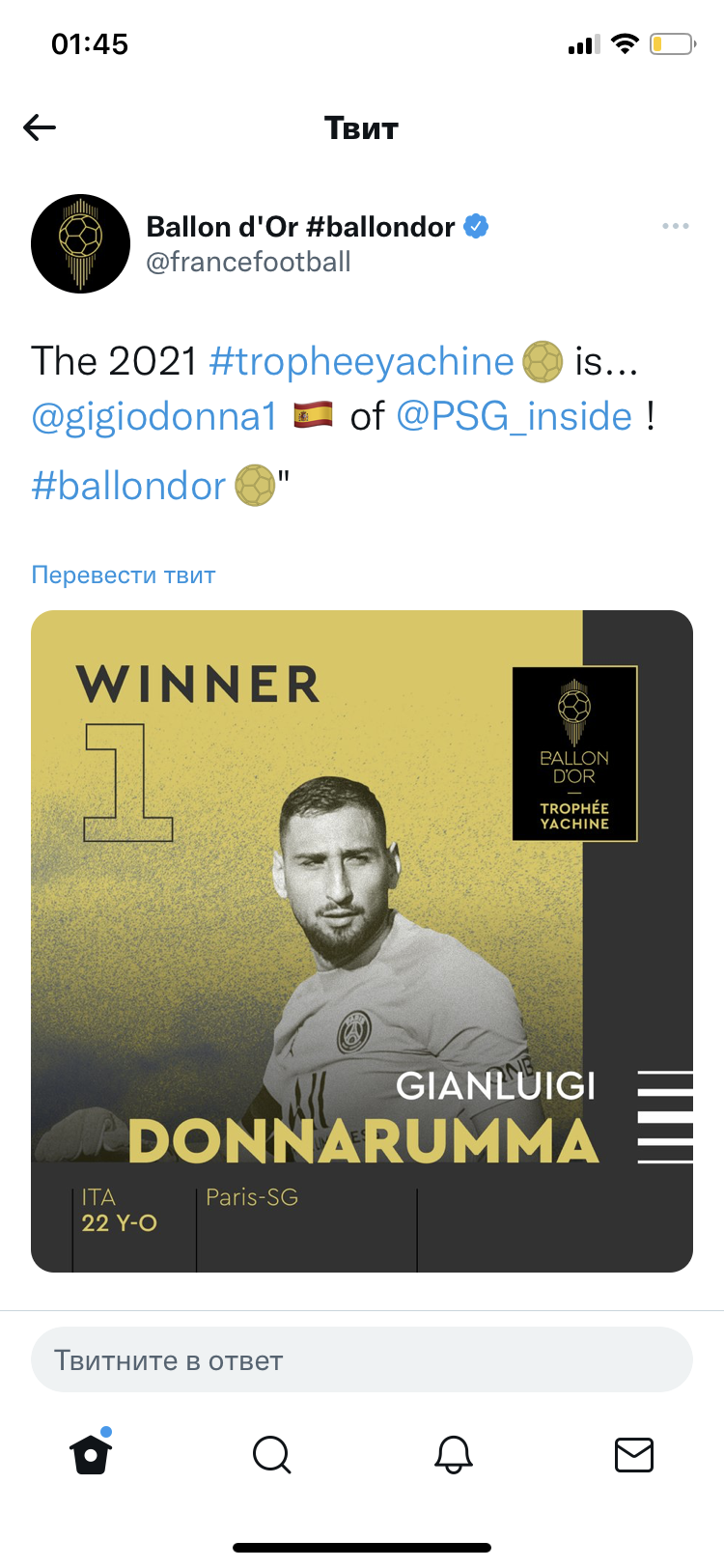 Вчера во время вручения «Золотого мяча» вратарь «ПСЖ» Джанлуиджи Доннарумма получил приз имени Льва Яшина - награду лучшему вратарю 2021 года.