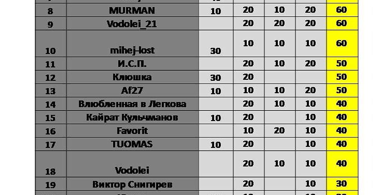 Наконец-то мной подведены первые итоги . Прошу всех посмотреть свои результаты и проверить: давно не считала, может забыла что-то. У нас, кстати, появились лидеры в гонке за хрустальным глобусом. Кто-то , если я упустила, не досчитается по моей вине баллов, а кто-то за то, что не указал имя одного из братьев БЁ