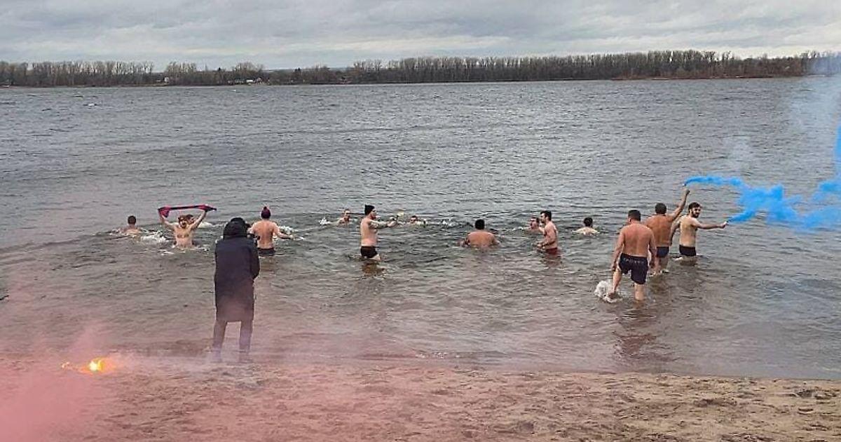 Как передает корреспондент Sport24 Алина Матинян, фанаты армейцев устроили массовый заплыв в реке при температуре воды +2,8 градуса.