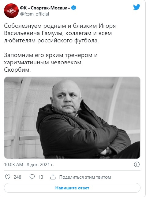 Спартак» через Twitter высказал соболезнования в связи со смертью экс-тренера «Ростова» Игоря Гамулы.