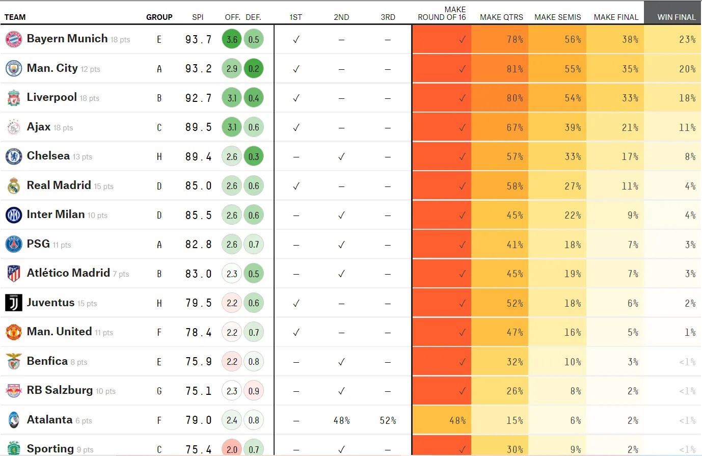 С другой стороны, есть неплохие шансы на выход в четвертьфинал - 52%, в то время как основным фаворитом турнира является мюнхенская «Бавария» - вероятность 23%, что немного выше, чем у «Манчестер Сити» - 20%.