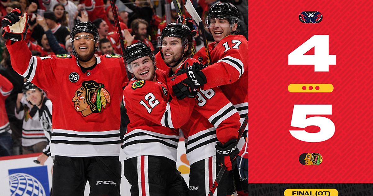 "Чикаго Блэк Хоукс"-"Вашингтон Кэпиталз" 5:4 (ОТ).Калеб Джонс в овертайме принёс победу хозяевам.Алекс ДеБринкат забросил 2 шайбы,Калеб Джонс набрал 2 очка (1+1),Брендон Хагель с Кирби Дачем и Патриком Кейном отдали по 2 результативные передачи,Марк-Андре Флери отразил 42 броска.У гостей Александр Овечкин и Конор Шири набрали по 2 очка (1+1),Ти-Джей Оши отдал 2 результативные передачи.