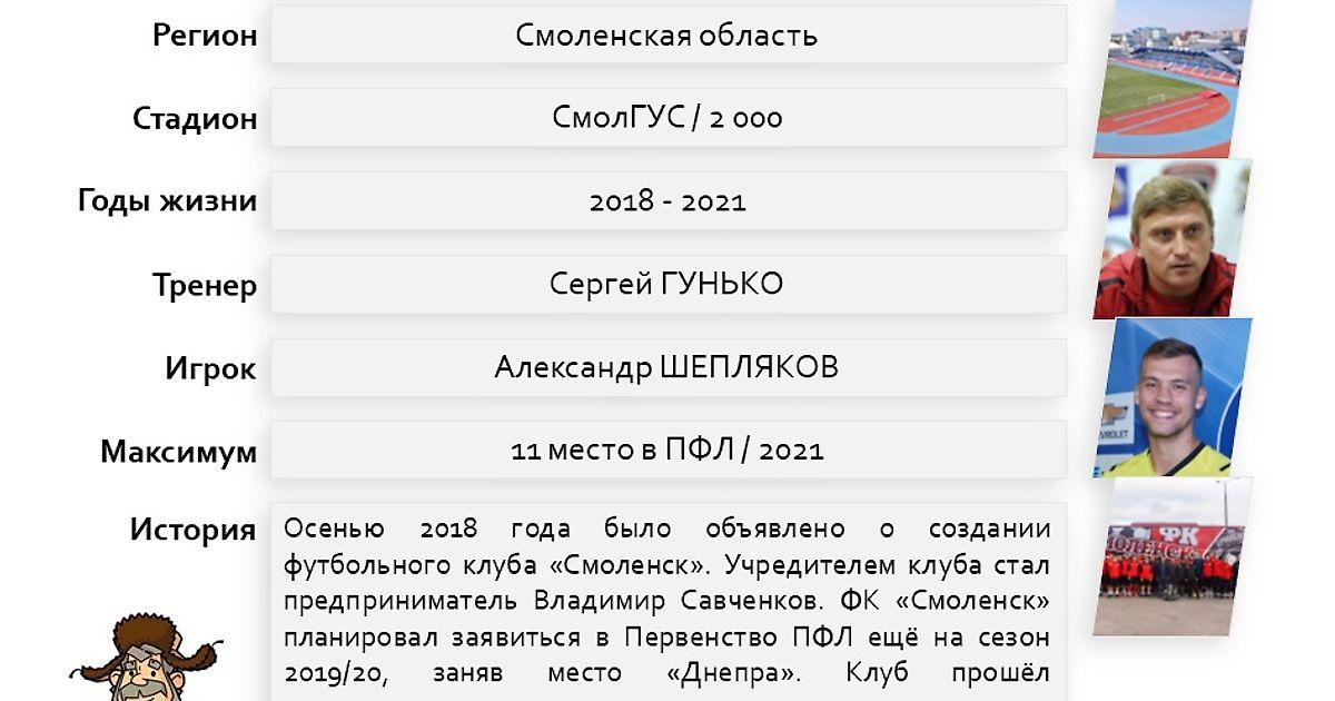 История смоленского футбола пропитана только горестью. Очередная попытка возродить что-то способное к сопротивлению не выдержало испытание деньгами - очень быстро клуб перестал существовать, хотя еще в начале этого сезона ощущения безысходности не было. Клуб подружился с фанатами, переделал цвета в исторические, но хватило их всего на 3 тура.....
