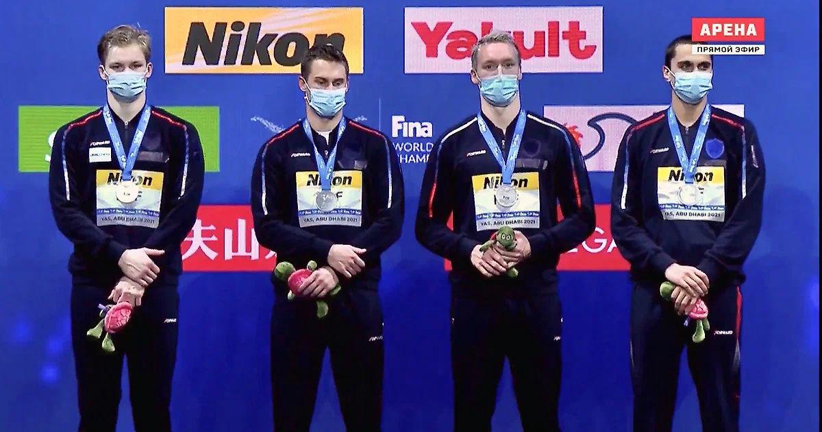 Это наш серебряный вид на последних чемпионатах мира и Олимпиаде. Обычно у нас плотная борьба с американцами, австралийцами, британцами и итальянцами. Австралийцы и британцы сегодня отсутствуют. Но нарисовались бразильцы в качестве плотных конкурентов. Уплыли на большой просвет американцы, атакуя бегущую линию мирового рекорда. На первом этапе Владислав Гринёв проплыл за 1.43,18 – это пятое время среди участников первого этапа. На втором этапе Александр Щёголев выводит нашу команду на второе место, показав лучшее время среди всех участников эстафеты 1.40,86. На третьем этапе Михаил Вековищев удерживает вторую позицию с 1.42,16. И финишёр Иван Гирёв проплывает свой этап за 1.42,92, что приносит российской команде серебро – 6.49,12. Американцам не хватило до мирового рекорда 0,19 секунды – 6.47,00. Бронза у бразильцев – 6.49,60.
