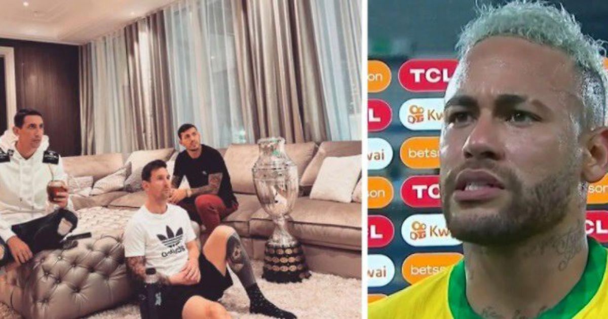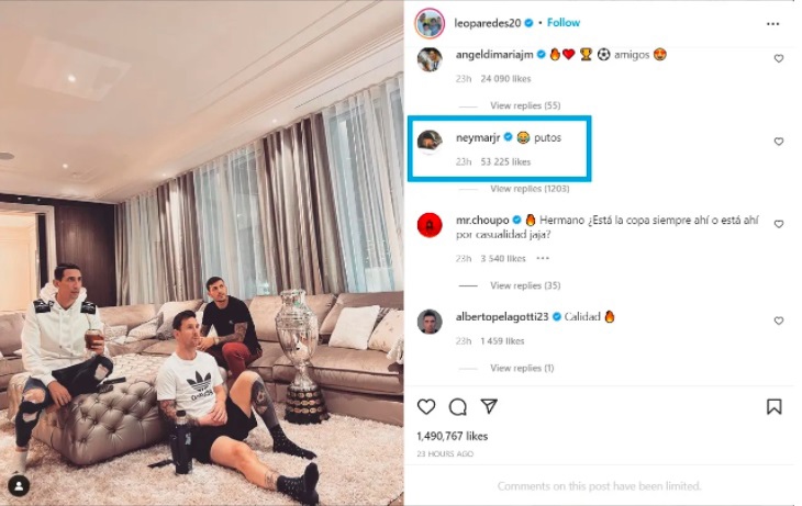 Леандро Паредес рассердил Неймара последней публикацией в Instagram, на которой запечатлены его товарищи по «ПСЖ» и сборной Аргентины Анхель Ди Мария и Лео Месси, они отдыхают на диване, а трофеем Кубка Америки стоит рядом с ними.