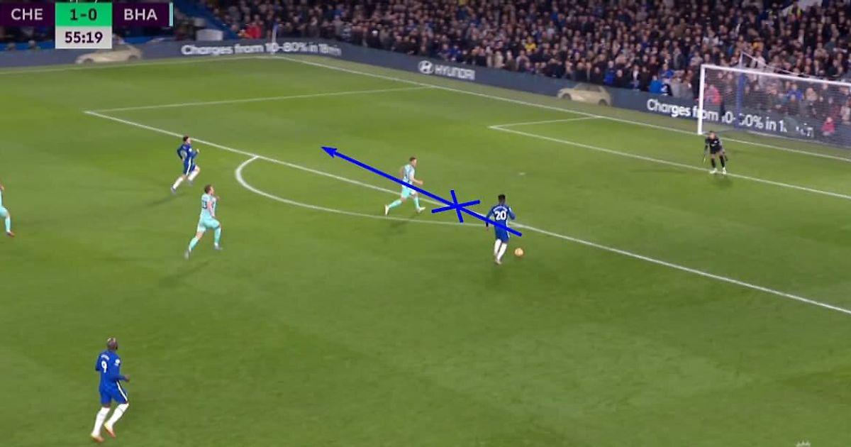 Здесь Маунт остается один против троих игроков. Конечно, через несколько секунд подключились и правый латераль Пулишич, и Жоржиньо, но несколько метров пространства «Брайтон» уже себе отвоевал.