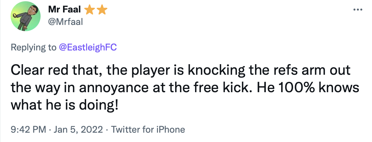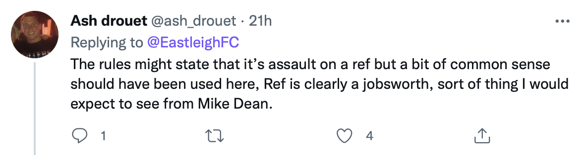 В общем мнения разделились. Интересно, что сам «Истли» даже опубликовал видео момента (выше), как будто намекая, что ничего страшного на самом деле не произошло. Впрочем, решение арбитра уже все равно не изменить – как подтвердил клуб, их апелляцию отклонили.