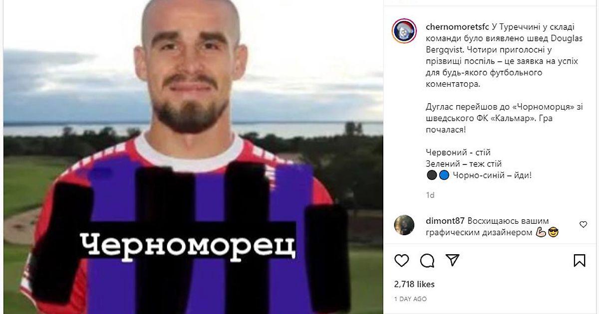 Украинский клуб бесплатно подписал шведского защитника Дугласа Бергквиста из «Кальмара». Для анонса выбрали фотографию, которую при трансфере использовал прошлый клуб – и просто в Paint неаккуратно раскрасили форму в цвета «Черноморца» и написали название новой команды.