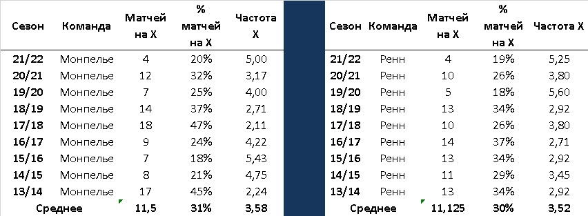 Но, чтобы не уйти в глубокий минус, я решил посмотреть, как играли Монпелье и Ренн на Х в предыдущих 7 сезонах.