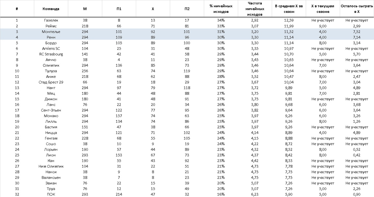 Лидирует команда Газелек, у команды 34% матчей на Х. Далее идет Реймс, потом Монпелье и Ренн. Меньше всего на Х сыграл ПСЖ.