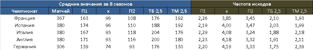 Я решил посчитать за последние 10 сезонов средние значения в чемпионате по ставкам П1/Х/П2, а так же тоталам. Ну и конечно же как всегда, я вывел среднюю частоту наступления события.