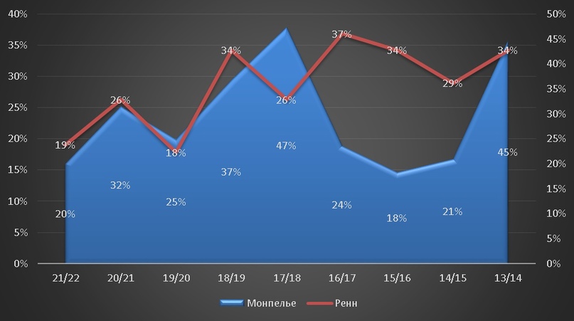 Я подсветил 2 команды — Монпелье и Ренн. Они меня привлекли тем, что команды являются лидерами по игре на Х, отыграли все 7 сезонов в высшей лиге, и тем что им осталось сыграть по 7 матчей на Х в текущем чемпионате. Это наивысший показатель, среди всех действующих участников турнира.