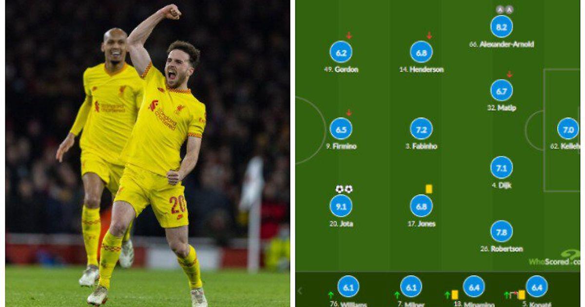 Портал WhoScored выставил оценки по итогам матча «Арсенал» – «Ливерпуль». Лучшим у красных, конечно, был Диогу Жота (9,1), оформивший победный дубль. На втором месте – Трент Александер-Арнольд (8,2) с двумя ассистами.