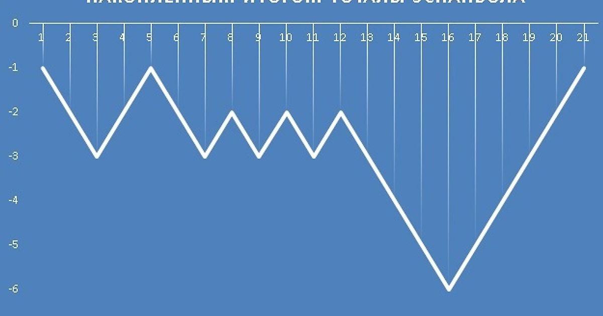 1. Синий график - накопленным итогом значения тоталов на Эспаньол. Посчитал за 21 тур, где ТМ -1 очков, ТБ - 1 очко. Итого, только к 21 туру команда выравнивается к нулю.