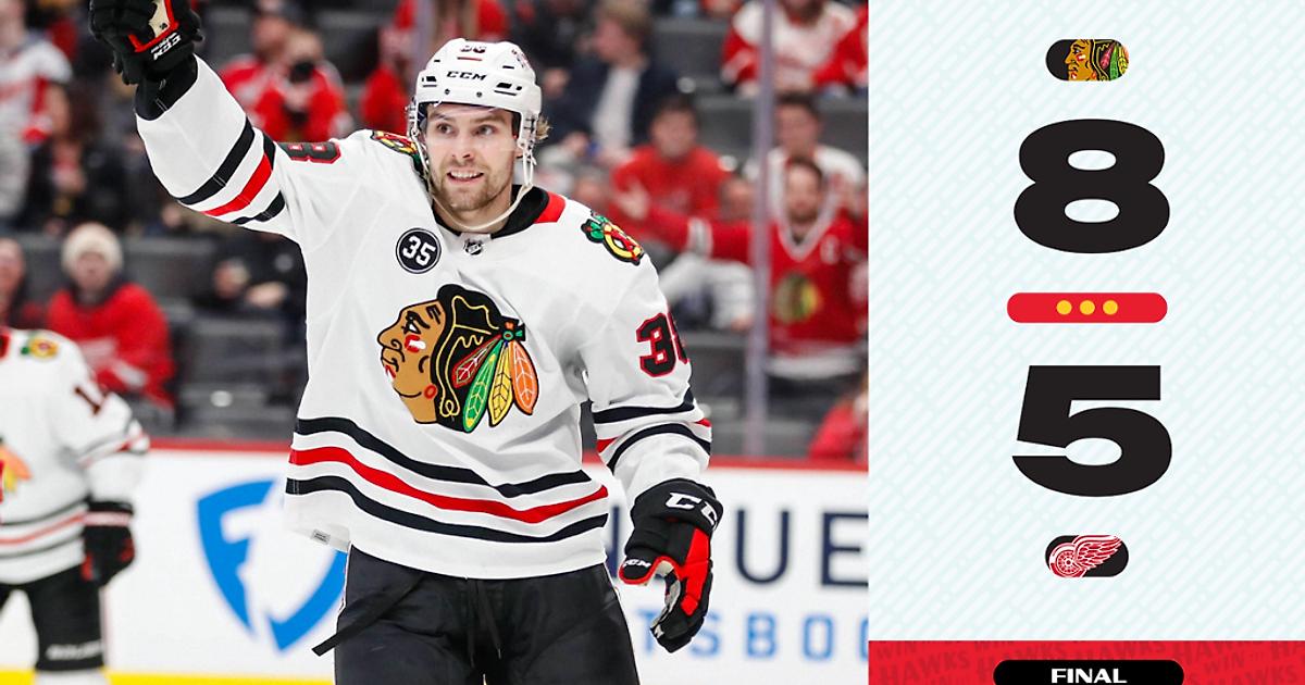 "Детройт Ред Уингз"-"Чикаго Блэк Хоукс" 5:8.Гости в первом периоде забросили 4 шайбы.Дилан Стром набрал 4 очка (3+1),Алекс ДеБринкат набрал 3 очка (2+1),Брендон Хагель набрал 2 очка (1+1),Патрик Кейн и Сет Джонс отдали по 2 результативные передачи,Марк-Андре Флери отразил 28 бросков.У хозяев Робби Фаббри и Тайлер Бертуцци набрали по 2 очка (1+1)."Чёные ястребы" прервали серию из 4 пораженй подряд.